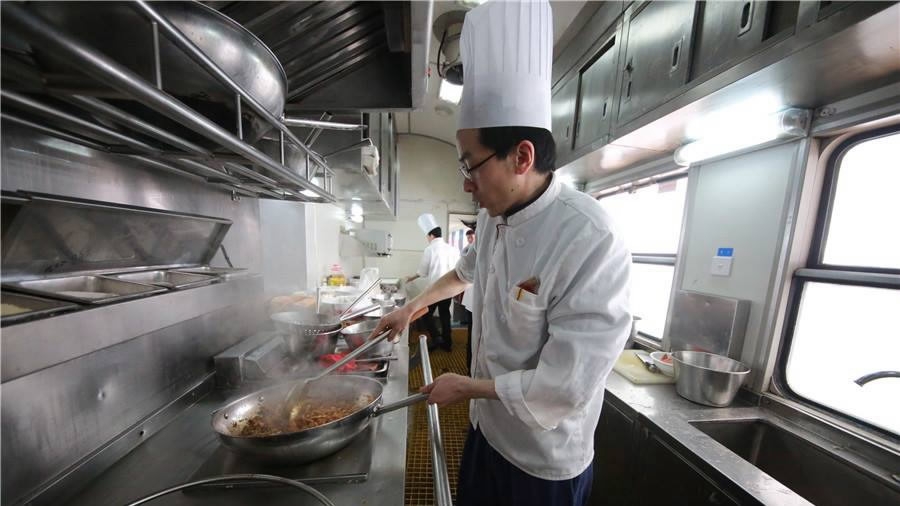 Some meals are prepared in kitchens on board trains like this K9441 service on Feb 6. /China Daily Photo