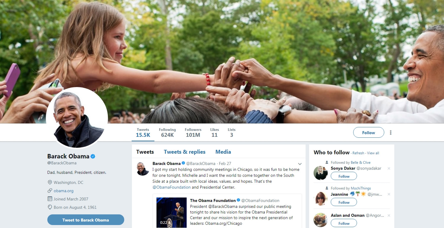 Obama now has over 101 million followers on Twitter. /Twitter screenshot