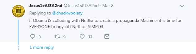 “If Obama is colluding with Netflix to create a propaganda Machine, it is time for EVERYONE to boycott Netflix,” another user @Jesus1stUSA2nd claimed.