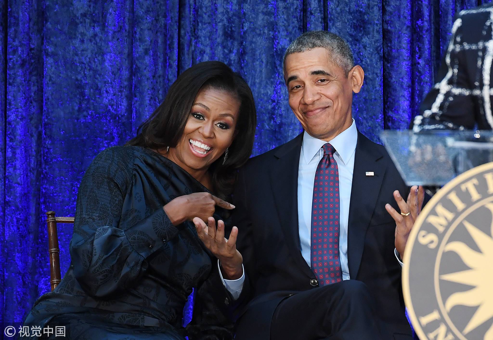 Obama and Michelle at an unveiling ceremony for their portraits at the Smithsonian's National Portrait Gallery in Washington, February 12, 2018. /VCG Photo