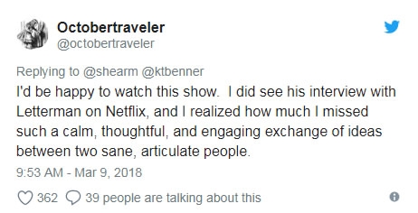 “I'd be happy to watch this show. I did see his interview with Letterman on Netflix, and I realized how much I missed such a calm, thoughtful, and engaging exchange of ideas between two sane, articulate people,” Twitter user @Octobertraveler noted.