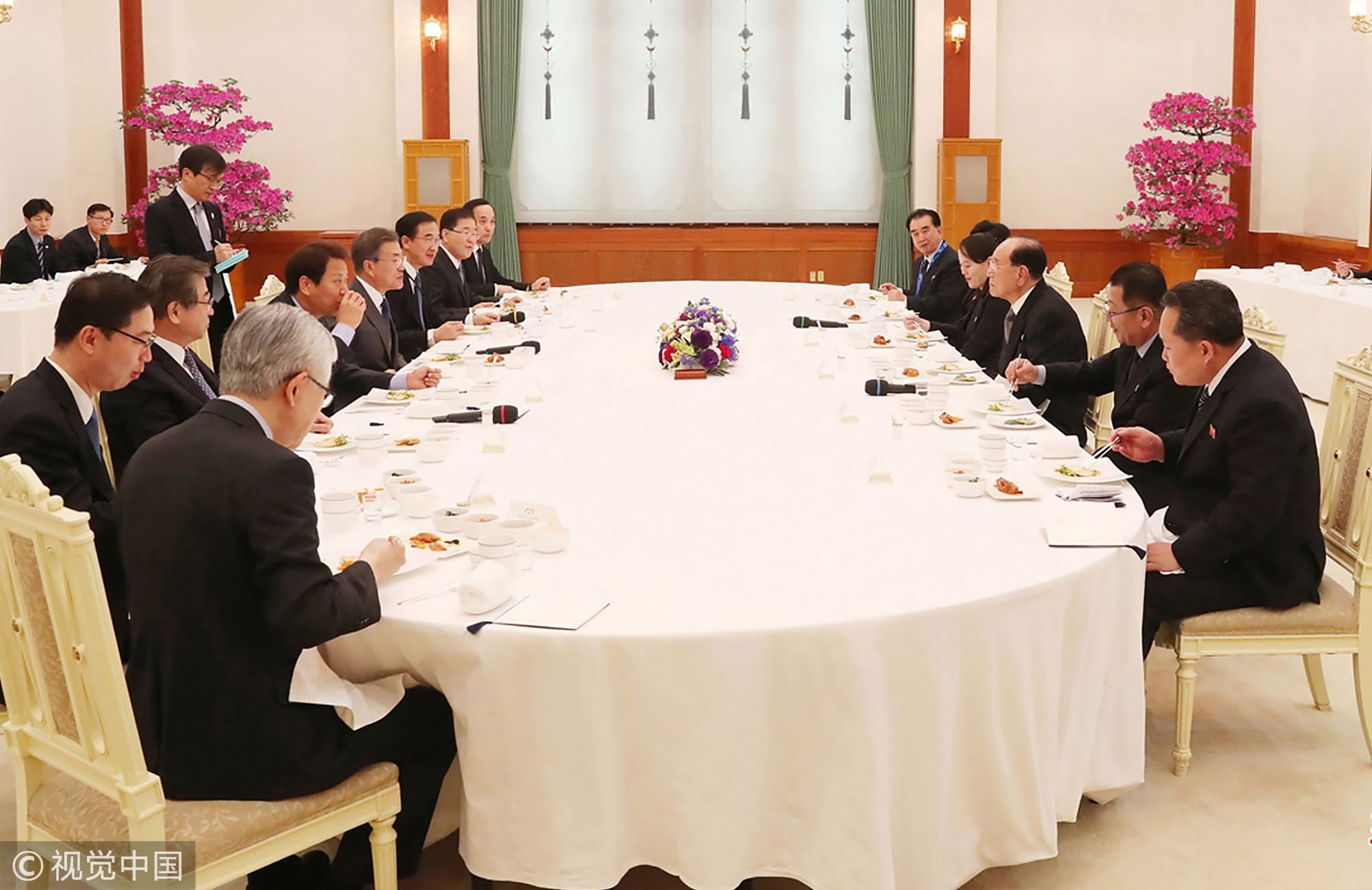ROK President Moon Jae-in (5L) and Kim Yo Jong (4R), DPRK leader Kim Jong Un's sister, and the DPRK's ceremonial head of state Kim Yong Nam (3R) have a luncheon together at the presidential Blue House in Seoul on February 10, 2018. /VCG Photo