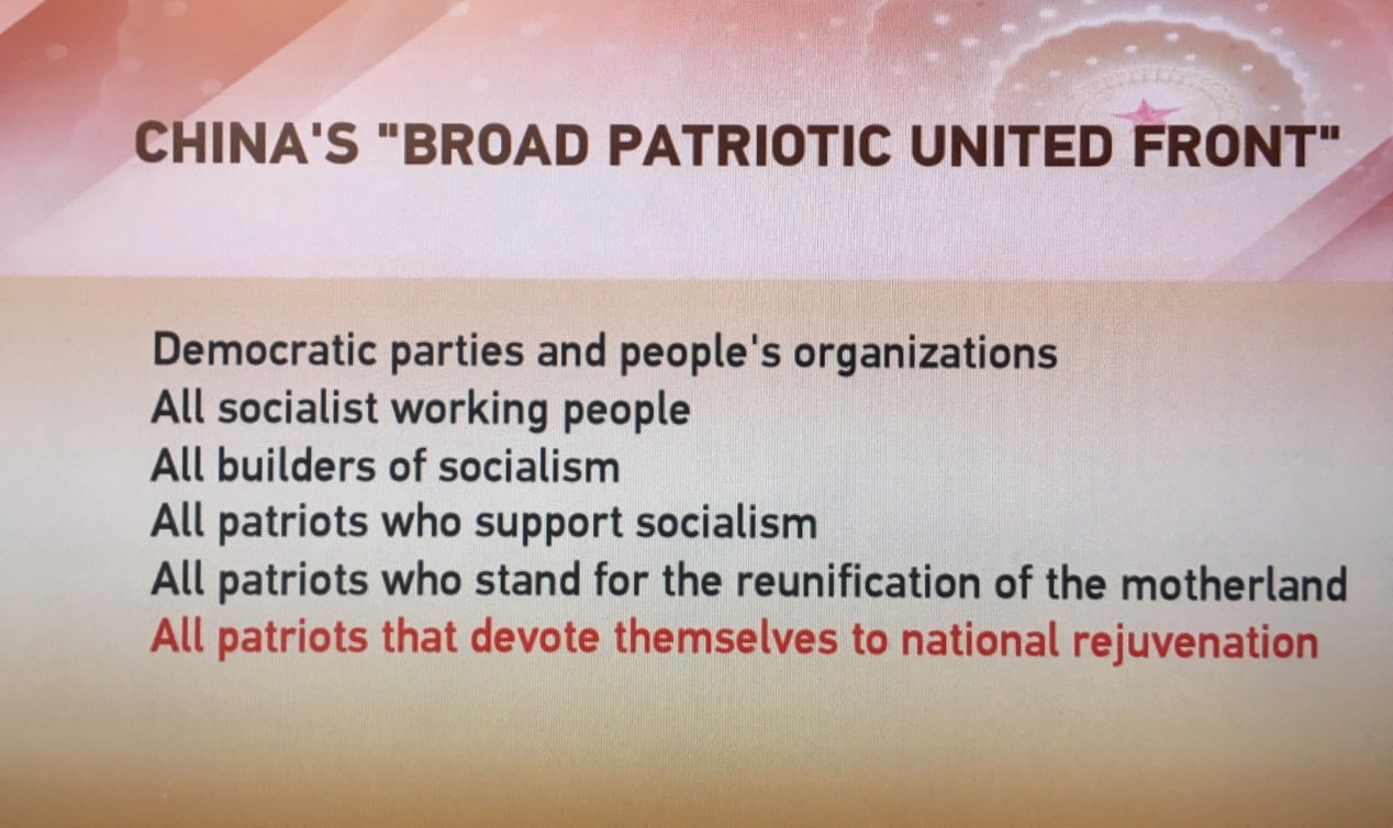 "General Secretary Xi said, 'we're going to draw the maximum concentric circle, get the greatest common divisor.' That's to unite all forces that can be united, up to the last, for the rejuvenation. I think it's a requirement of our time."