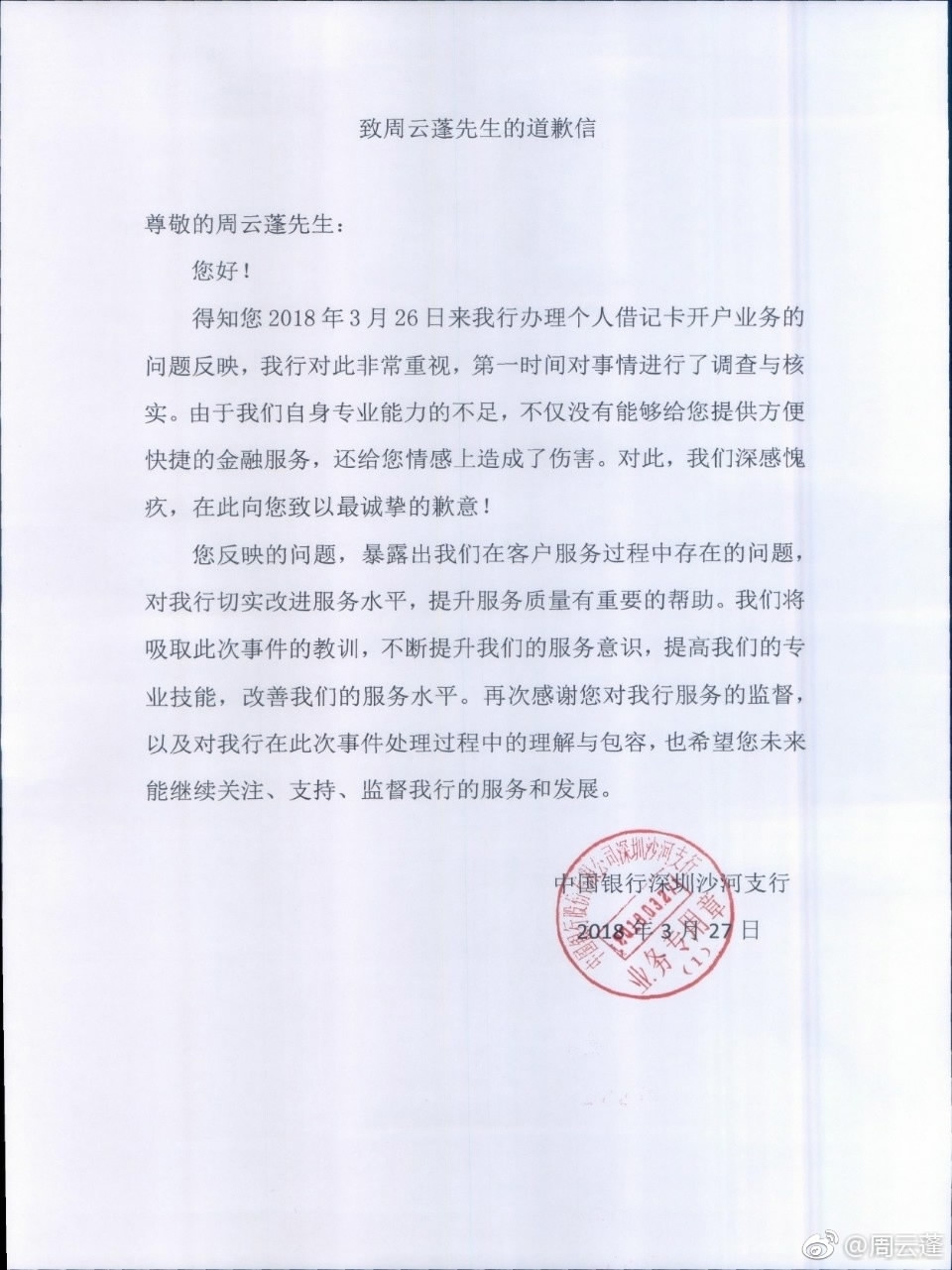 Bank of China's apology letter to Zhou Yunpeng / Photo from Zhou's Weibo account