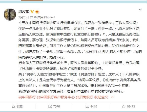 Bank of China denied famous blind singer Zhou Yunpeng a bank account and netizens are not happy.
