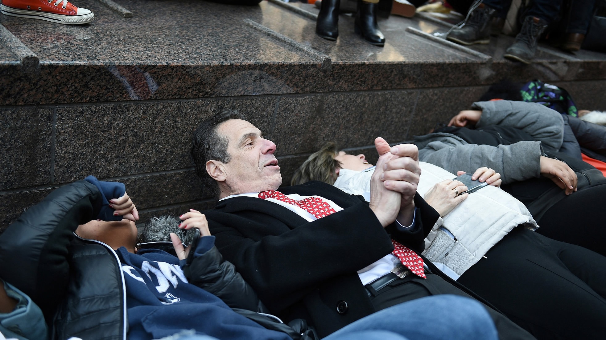 Video from the protest shows Cuomo stretching himself out on the sidewalk and participating in the "die-in," lying on the ground and clapping as students chanted “Gun control now.” /VCG Photo