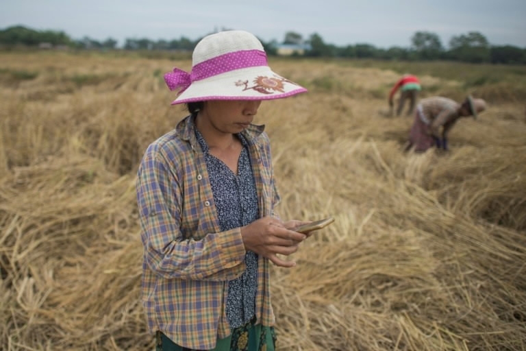 A free app on San San Hla's smartphone is her new weapon in the war against the dreaded stem borer moth that blighted her rice paddy in southern Myanmar for the last two years. /AFP Photo
