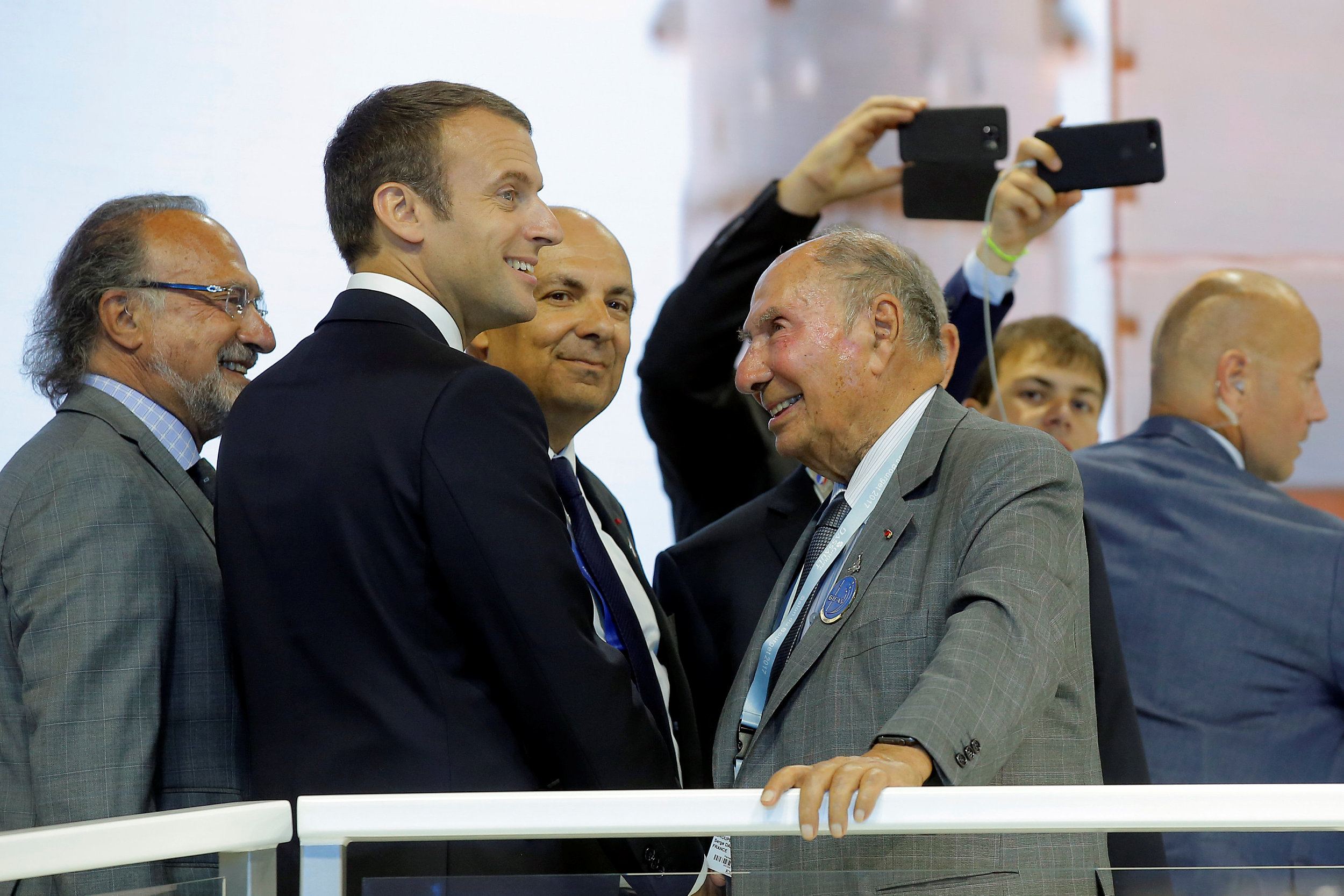 French President Emmanuel Macron (2ndL) talks with Dassault Aviation CEO Eric Trappier (C) as Serge Dassault (2ndR), Chairman and CEO of Dassault Group, during a visit at the Paris Air Show in Le Bourget, north of Paris, France, on June 19, 2017. /VCG Photo