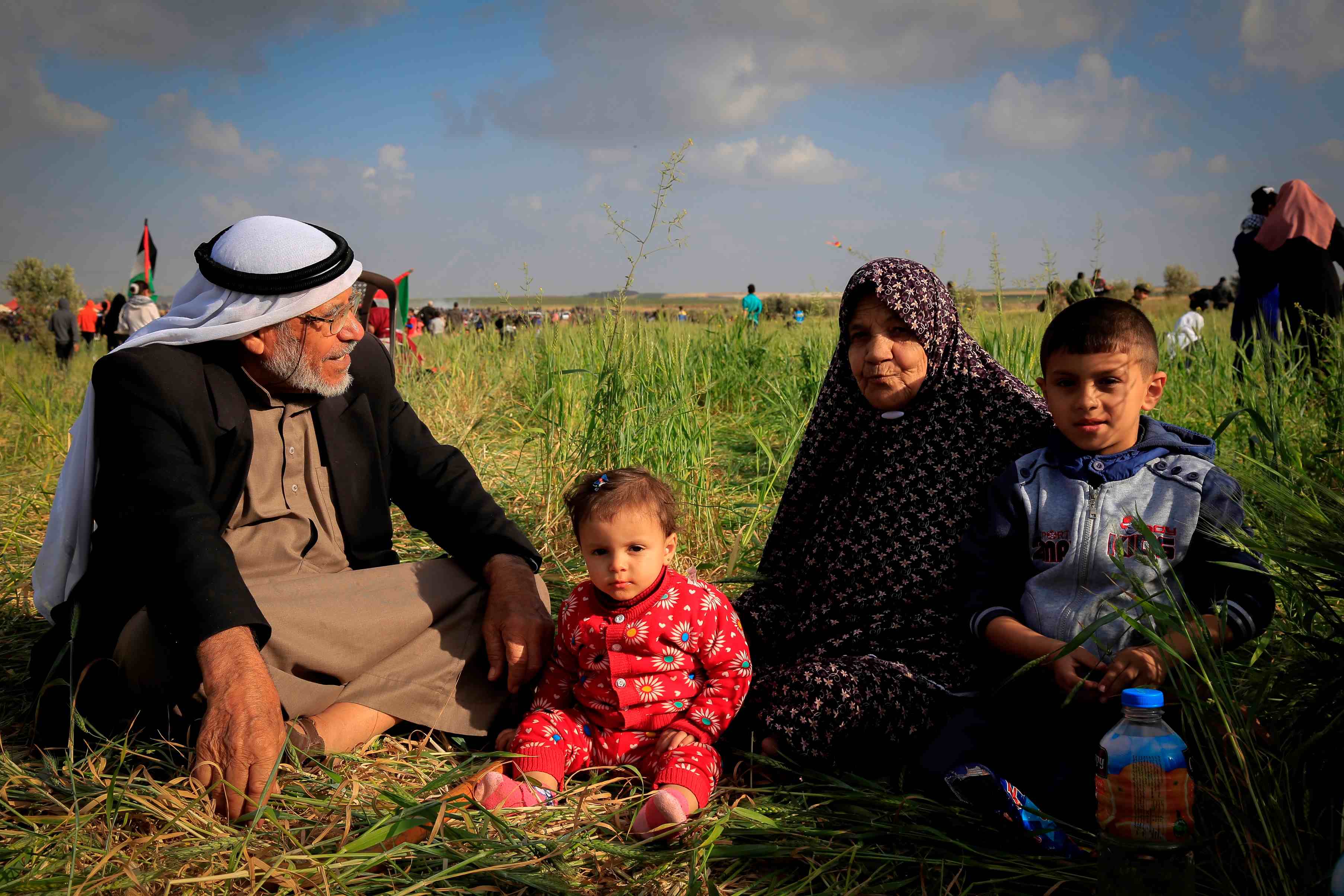 Palestinian Nimir Wadi with his wife and grandchildren at the eastern Gaza border with Israel, March 30, 2018. /CGTN Photo