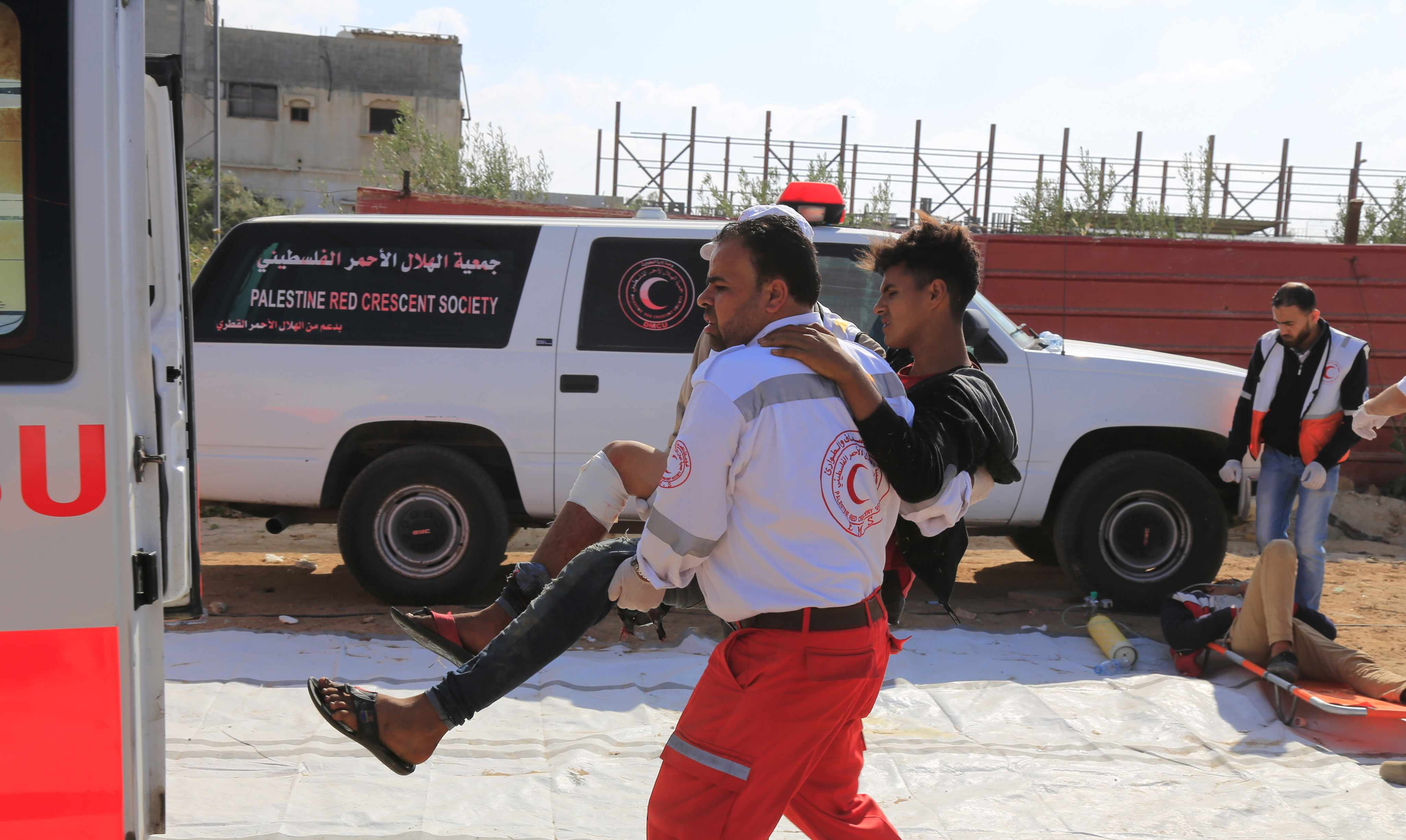 A Palestinian Red Crescent medical worker transports a man from the Gaza Strip border to hospital, March 30, 2018. /CGTN Photo