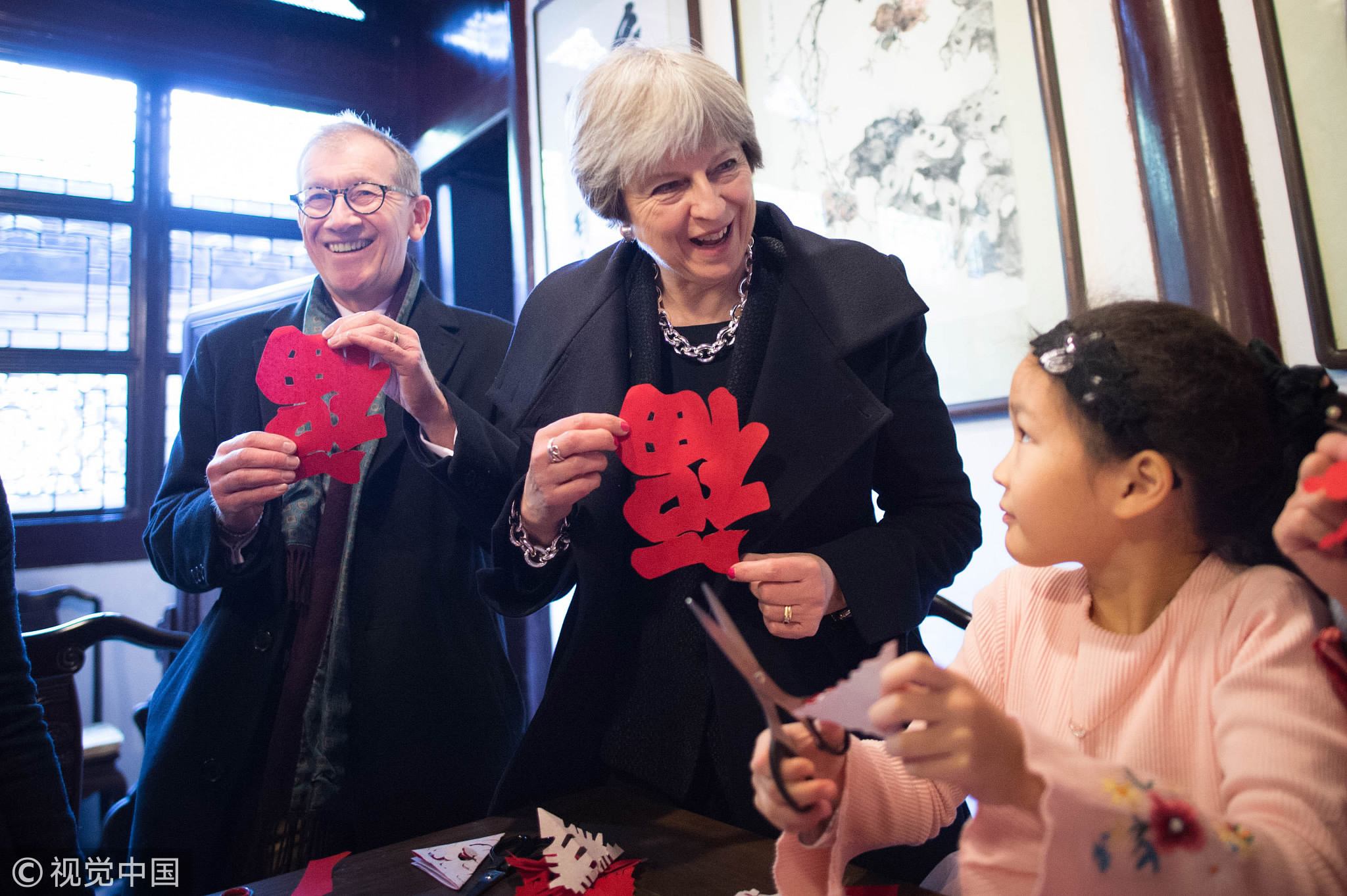 Theresa May and her husband Philip met with school children at Shanghai’s Yu Yuan Temple Garden, which is over 400 years old, on Feb. 2, 2018. During the visit, the couple also learned Chinese paper-cutting. /VCG photo