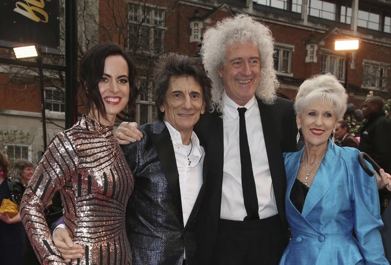Sally Wood, from left, musicians Ronnie Wood, Brian May