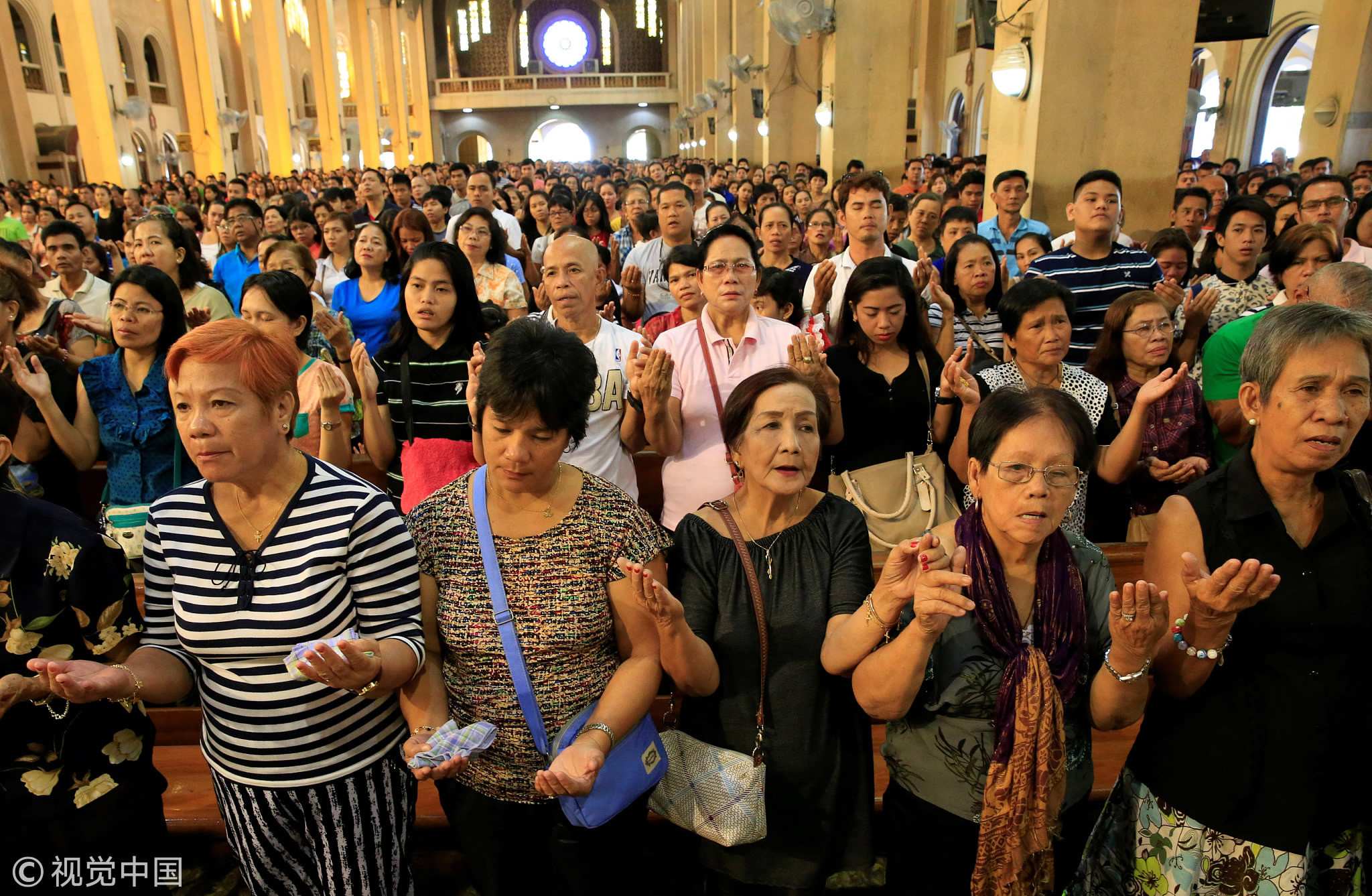 Filipino churchgoers hold hands while singing a religious song. /VCG Photo