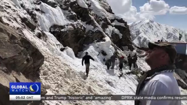 And he convinced on this day we will find gems, and orders one more blast. This time we decide to wait outside the mine. At nearly four-thousand meters, it is the first really warm day of the season, which is melting the snow. Suddenly, triggered by the powerful blast. The locals say we are lucky to be alive.