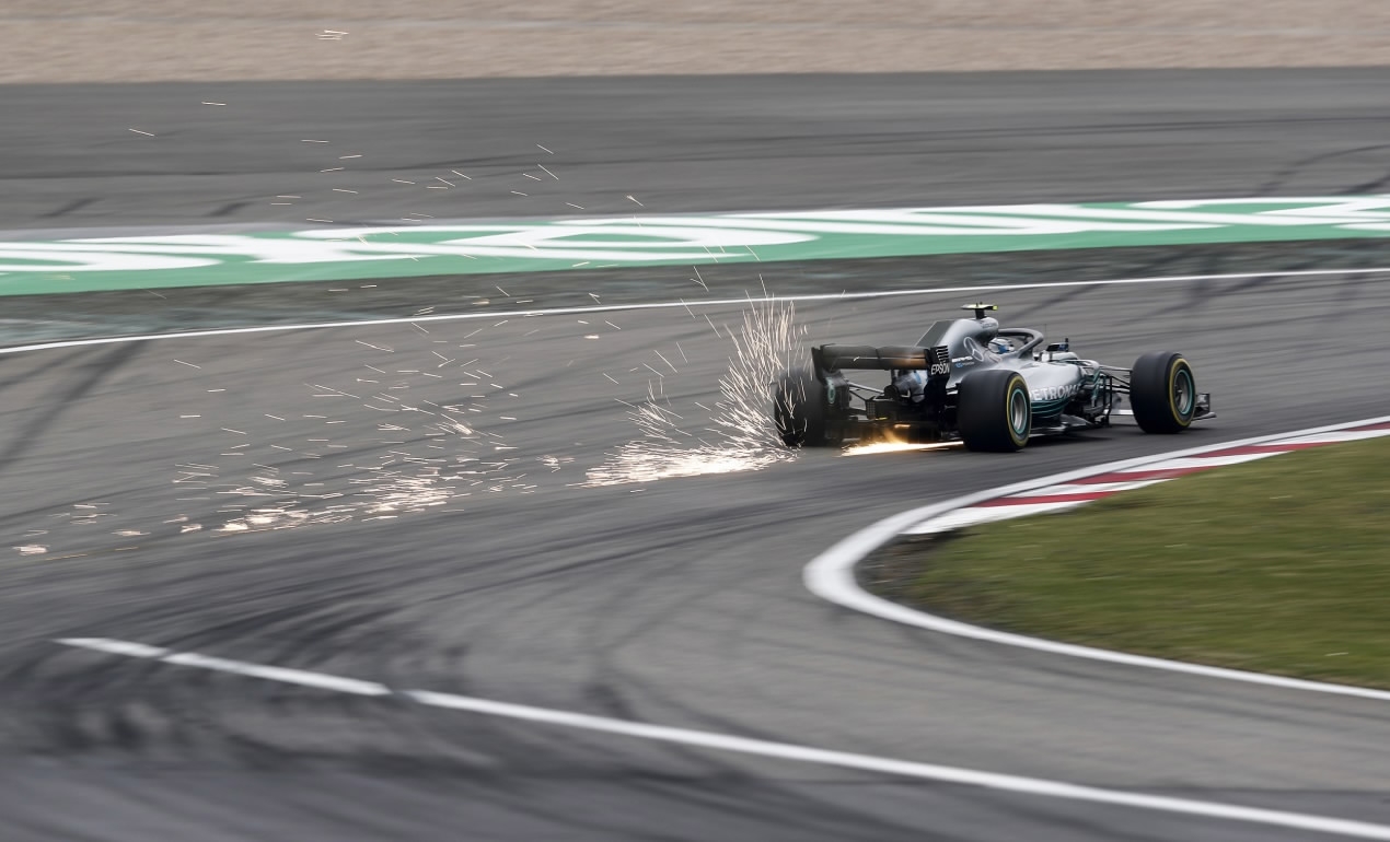 Sparks fly behind Lewis Hamilton of Great Britain, driving the (44) Mercedes AMG Petronas F1 Team Mercedes WO9 during practice. /VCG Photo