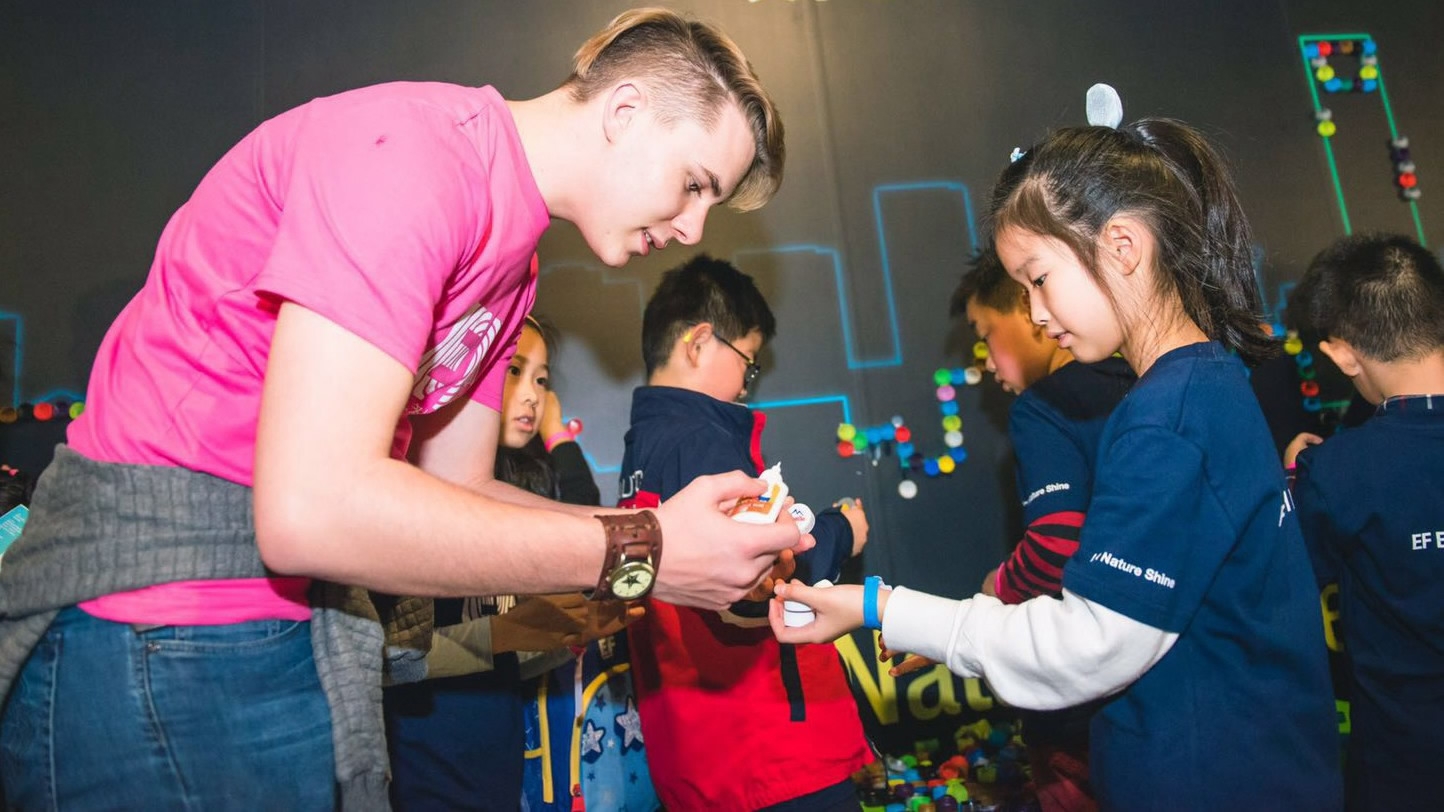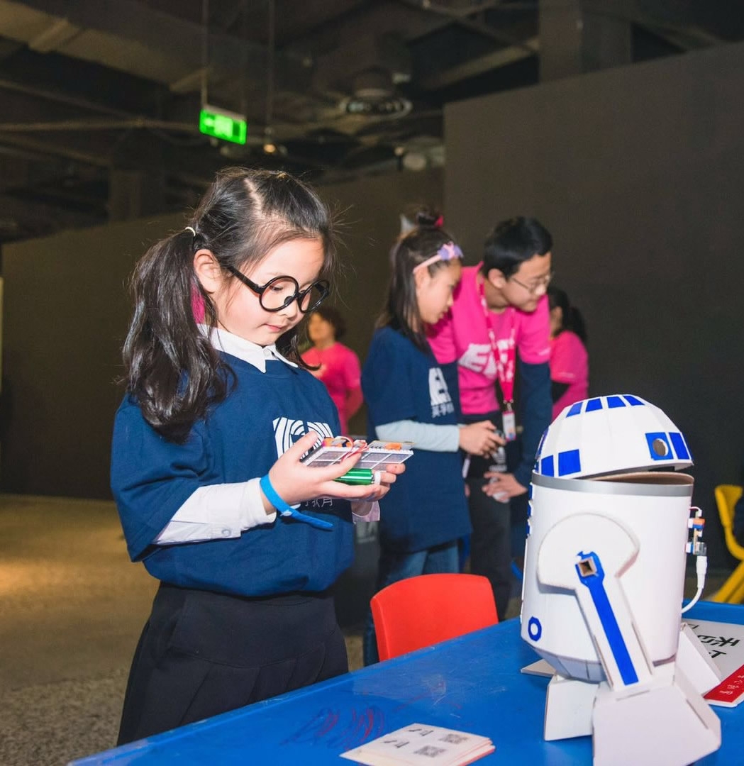 At the grand hall of the Oriental Pearl TV Tower in Shanghai, activities were held by an education organization to help kids develop their concept of environmental protection, including making environmentally friendly soap out of wasted cooking oil, understanding the basic mechanisms of robots, AI and unmanned cars.