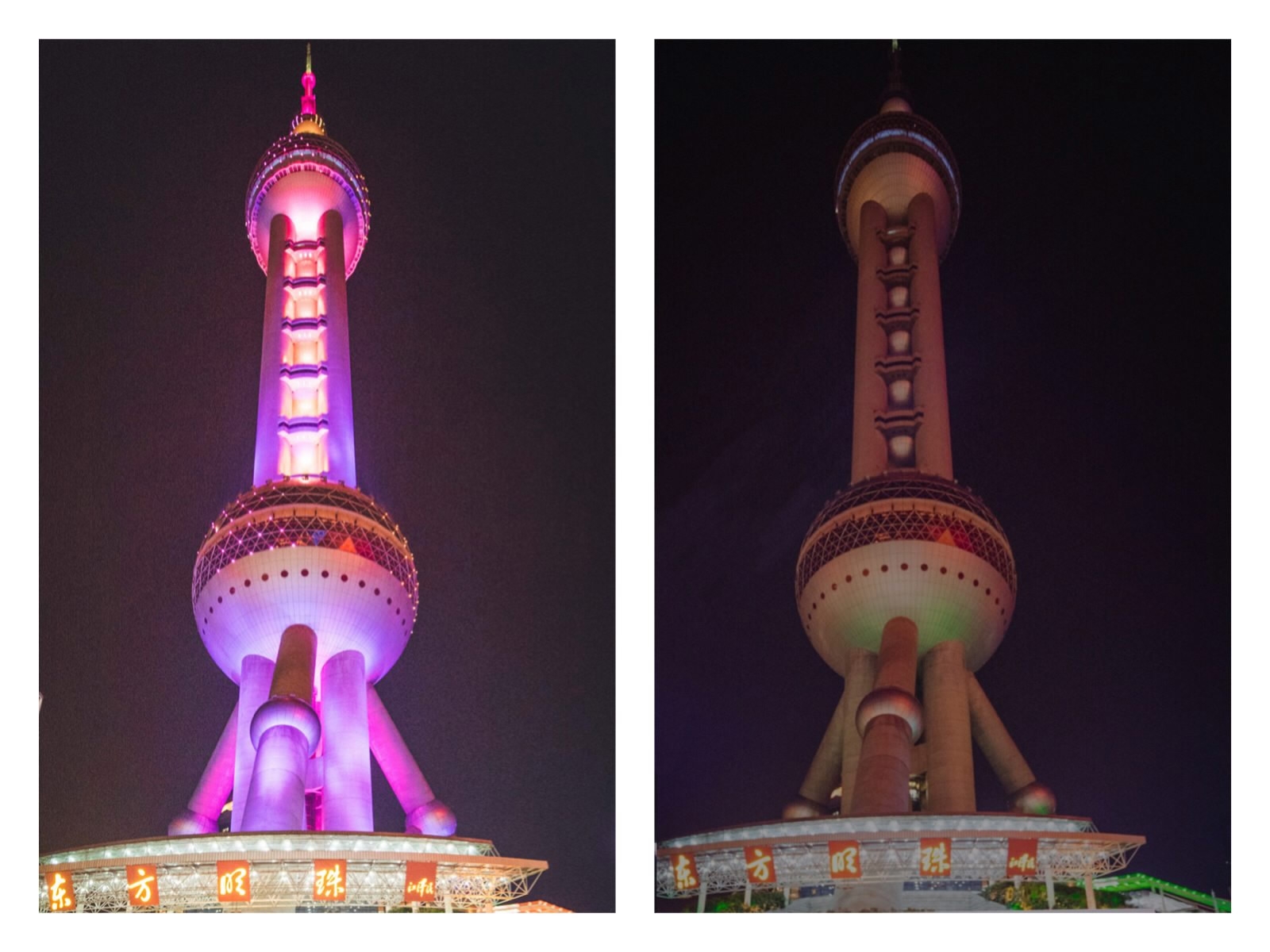 The Oriental Pearl TV Tower before and after its lights were switched off. /CGTN Photo