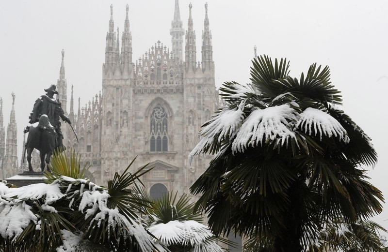 This March 2, 2018, palm trees are dusted with snow in front of Milan’s Gothic Cathedral, Italy. /AP Photo