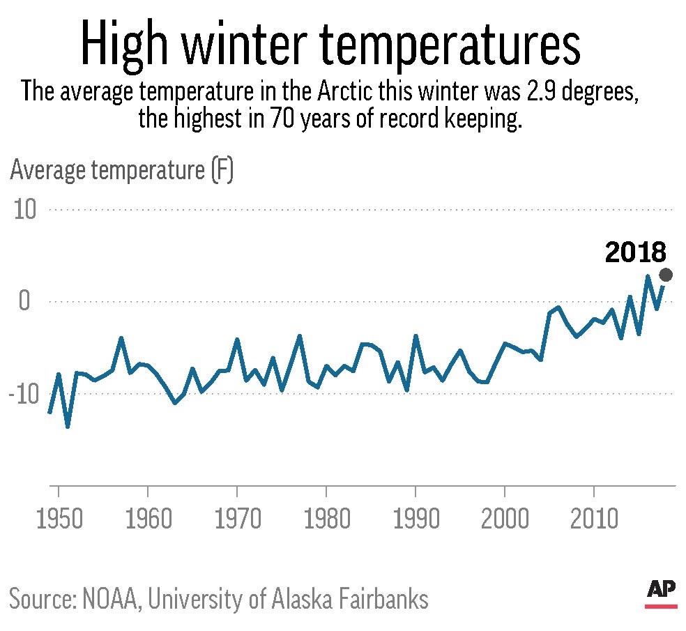 Chart shows average winter temperature measures from stations above 75 degrees latitude from 1949 to 2018. /AP Photo