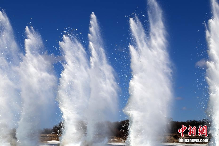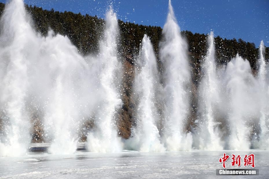 The plume of water and ice flied high into the sky, attracting people along the river to watch the spectacular scene. /Photo via Chinanews