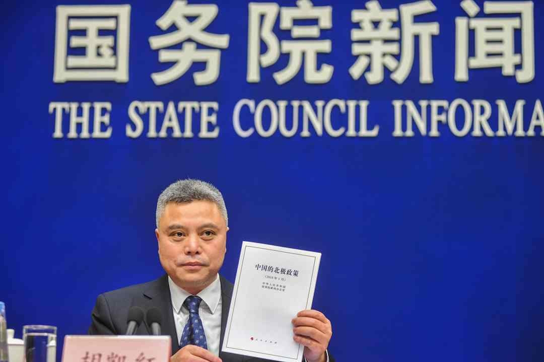 State Council information office spokesman Hu Kaihong displaying the White Paper on Arctic Policies /VCG Photo