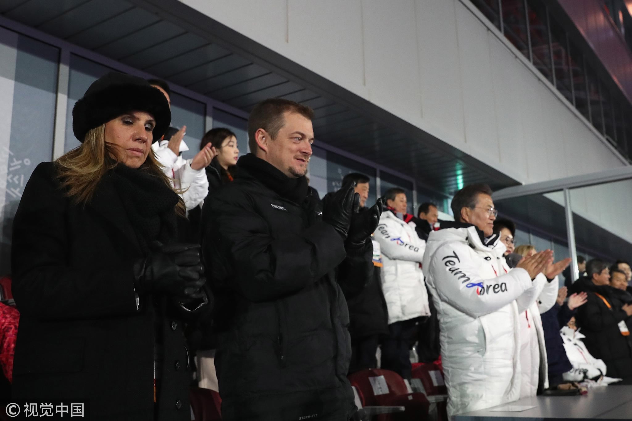 IPC President Andrew Parsons (C), his wife Marcela Parsons (L) and South Korean President Moon Jae-in (R) attend the opening ceremony. /VCG Photo