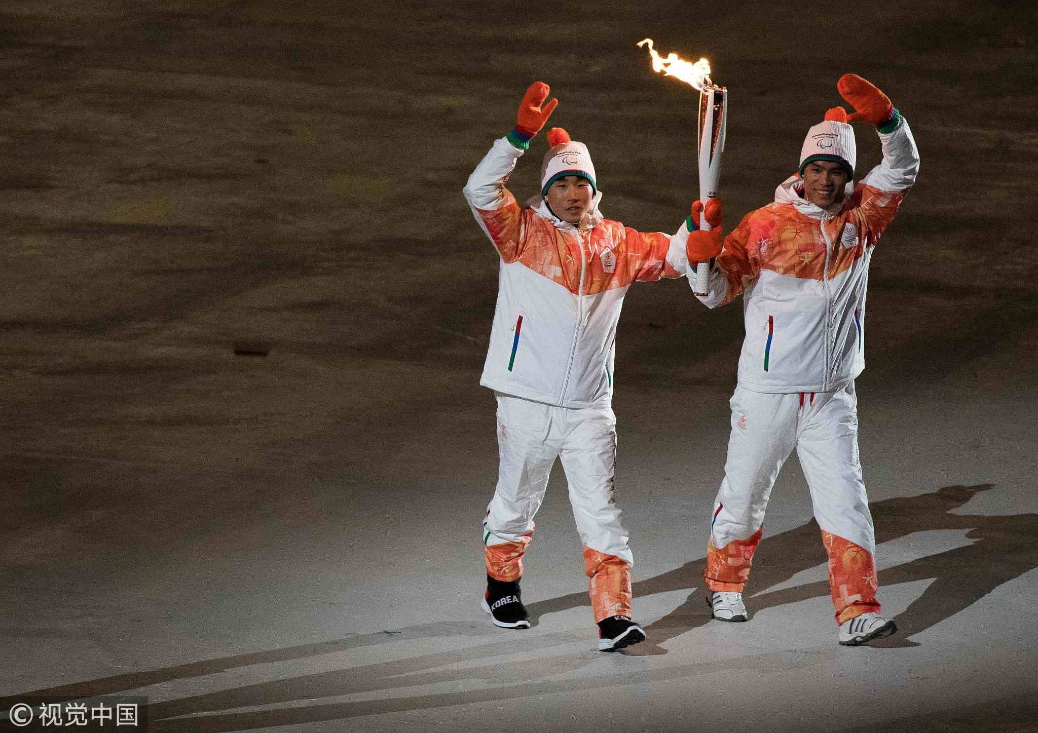 The ROK's Choi Bogue and the DPRK's Ma Yu Chol carry the Paralympic flame during the opening ceremony. /VCG Photo