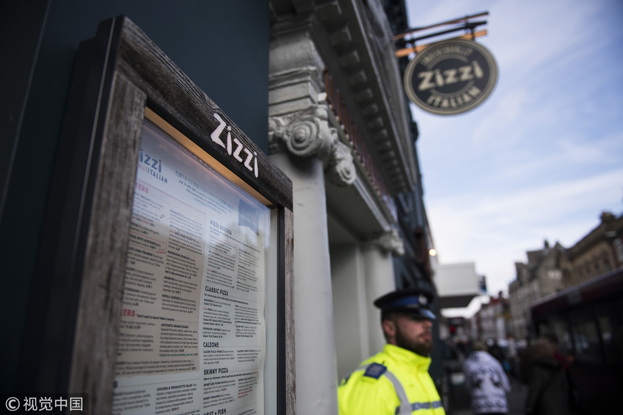 A police officer stands on guard outside Zizzi Restaurant in Salisbury, Wiltshire which is currently closed after former Russian spy Sergei Skripal and a woman in her 30s were taken ill with suspected poisoning. /VCG Photo
