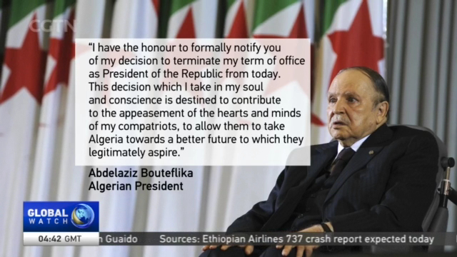 Shifting to Algeria, where President Abdelaziz Bouteflika has resigned after 20 years in power. Bouteflika submitted his resignation with immediate effect on Tuesday. His move comes amid weeks of mass protests against his rule. CGTN's Chao Mghono has more.