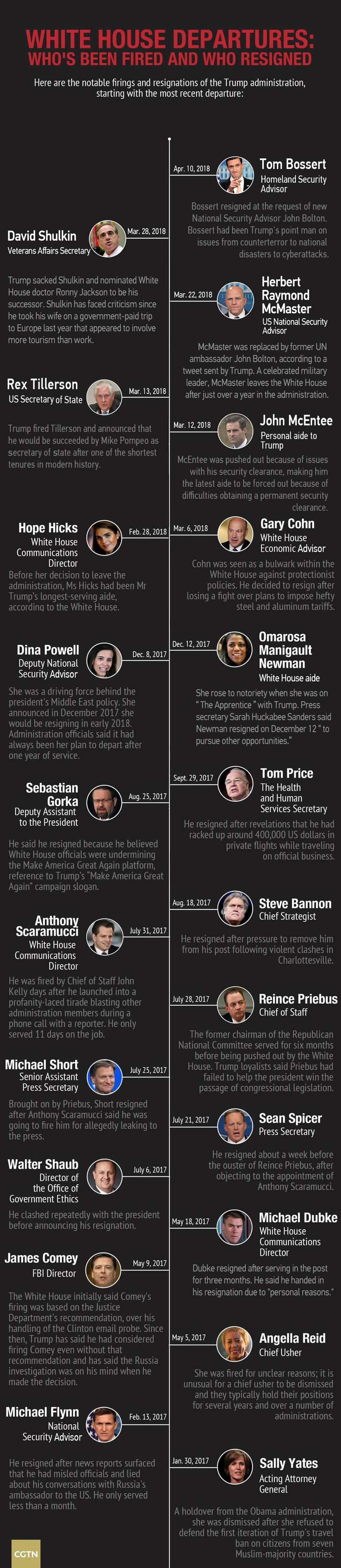 Other senior officials who have either resigned or been fired in the past few months include Secretary of State Rex Tillerson, National Security Advisor H.R. McMaster, National Economic Council Director Gary Cohn, Communications Director Hope Hicks, among others.