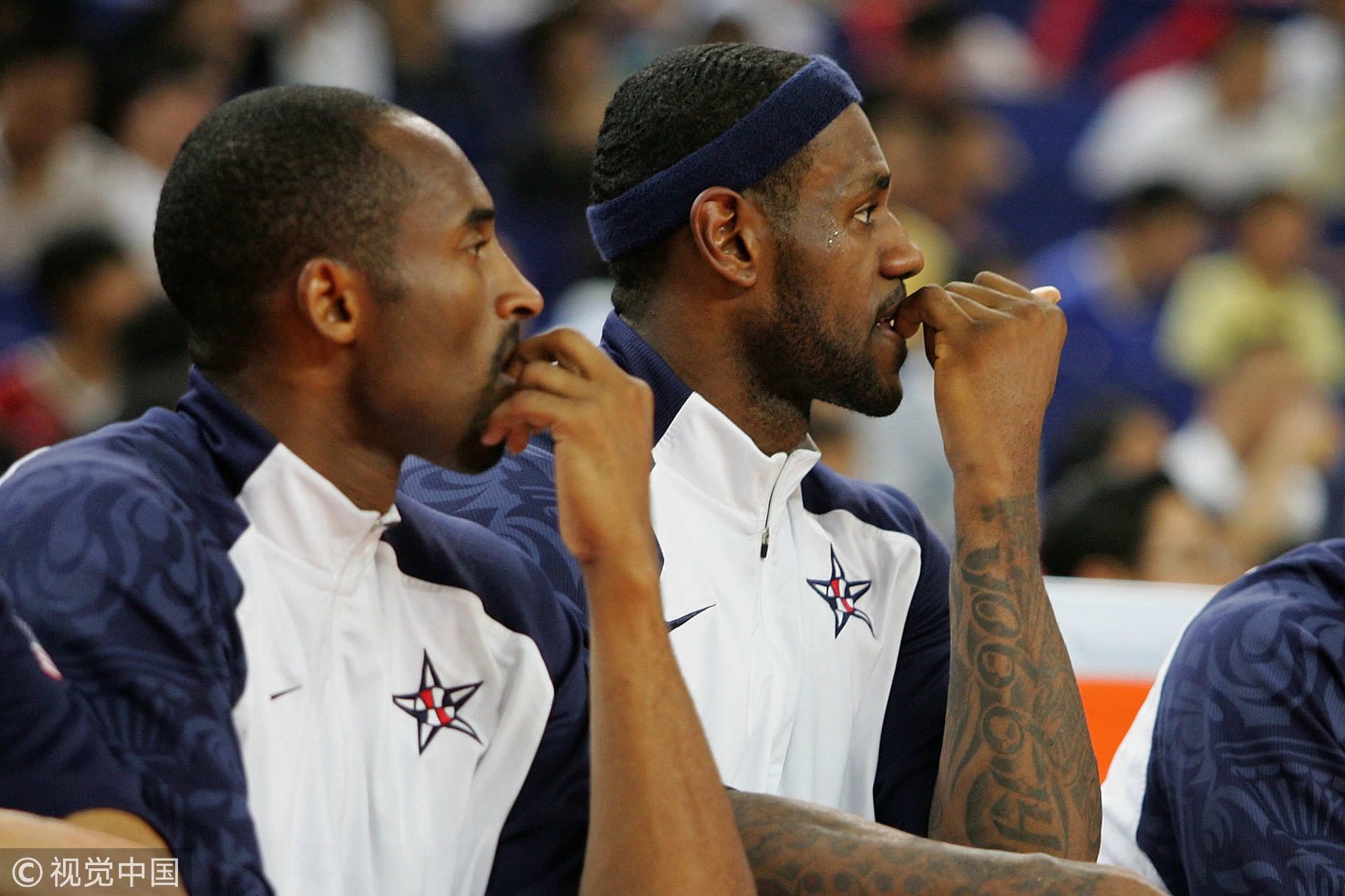 Kobe Bryant #10 and LeBron James #6 of the USA Basketball Men's Senior National Team sit on the bench during the USA Basketball International Challenge exhibition game against the Australia National Team at the Qizhong Arena, Shanghai, China, August 5, 2008. /VCG Photo