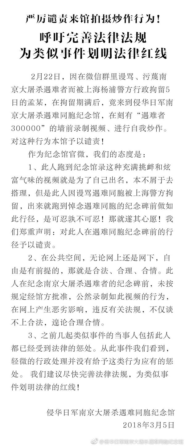 Pointing to Meng’s intention to be controversial on social media, the Memorial Hall published a statement on its official Weibo account condemning the man and called for a severe punishment.