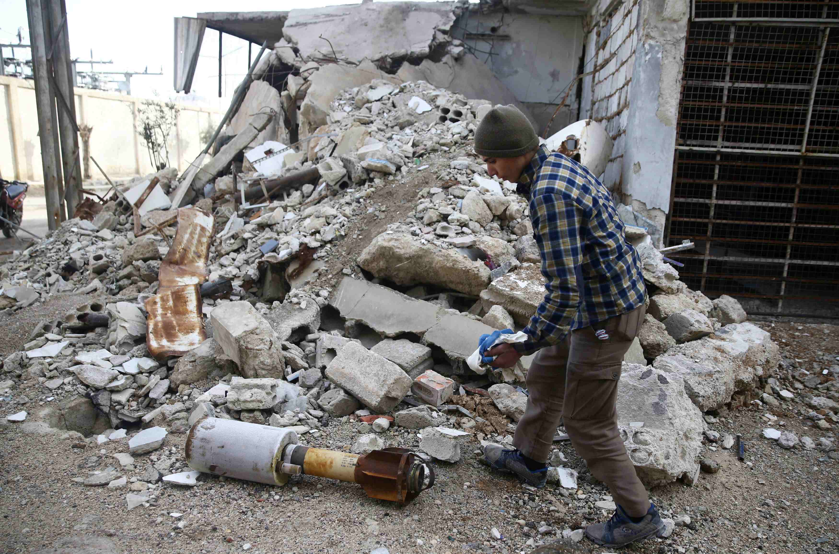 A man is seen near the remains of a rocket in Douma, Eastern Ghouta in Damascus,