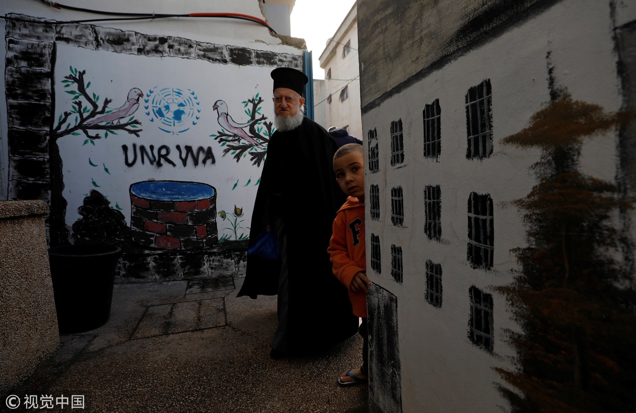 A Palestinian man walks past a logo of the UNRWA in Jalazone refugee camp, near the West Bank city of Ramallah, January 3, 2018. /VCG Photo