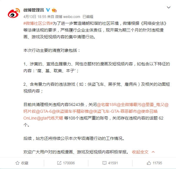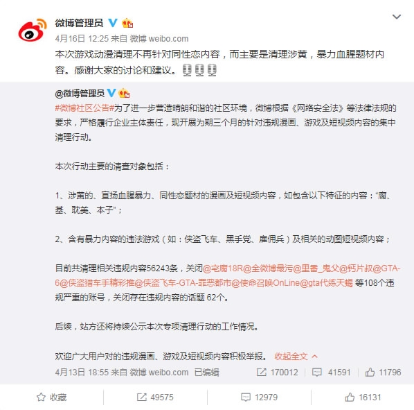 Weibo posted an announcement last Friday, saying that it would lauch a clear-up campaingn over the pornographic, violent and homoseuxal content on the platform. /CGTN Screenshot of Weibo
