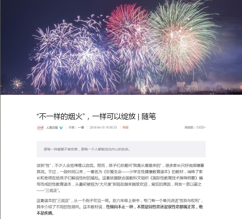 Surprisingly, People’s Daily, the official news organ of the Central Committee of the Communist Party of China (CPC), which normally does not comment on such issues, released a commentary on Sunday, saying that LGBT people are legal citizens and should be given the same rights as everyone else. It also added that people should put down their prejudices and embrace the difference. The People's Daily article was viewed more than 100,000 times.
