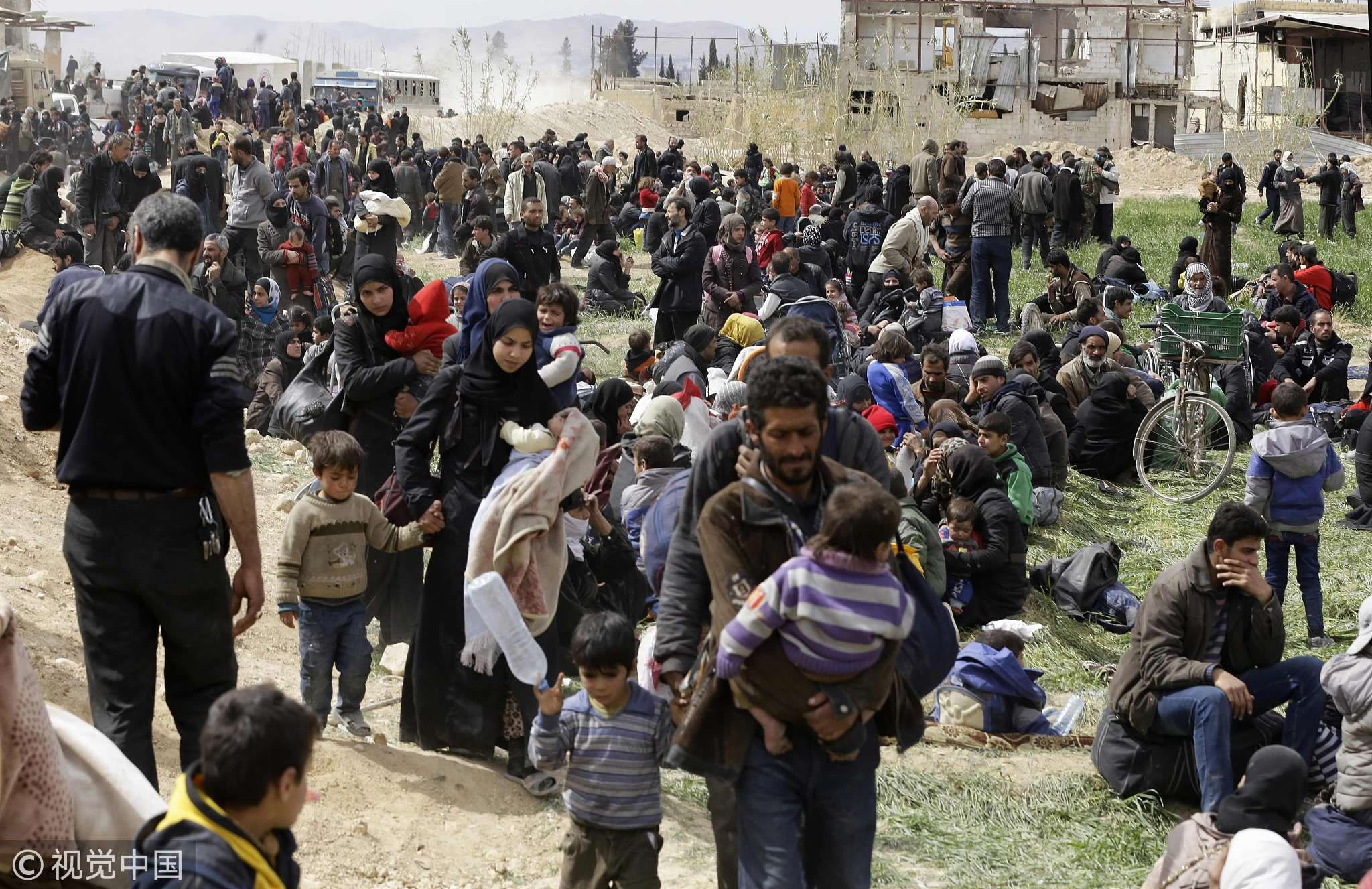 Syrian civilians evacuated from the Eastern Ghouta enclave pass through the corridor opened by the government forces in Hawsh al-Ashaari, Hammuriyeh (Hamouria) on the outskirts of the capital Damascus on March 18, 2018. /VCG Photo