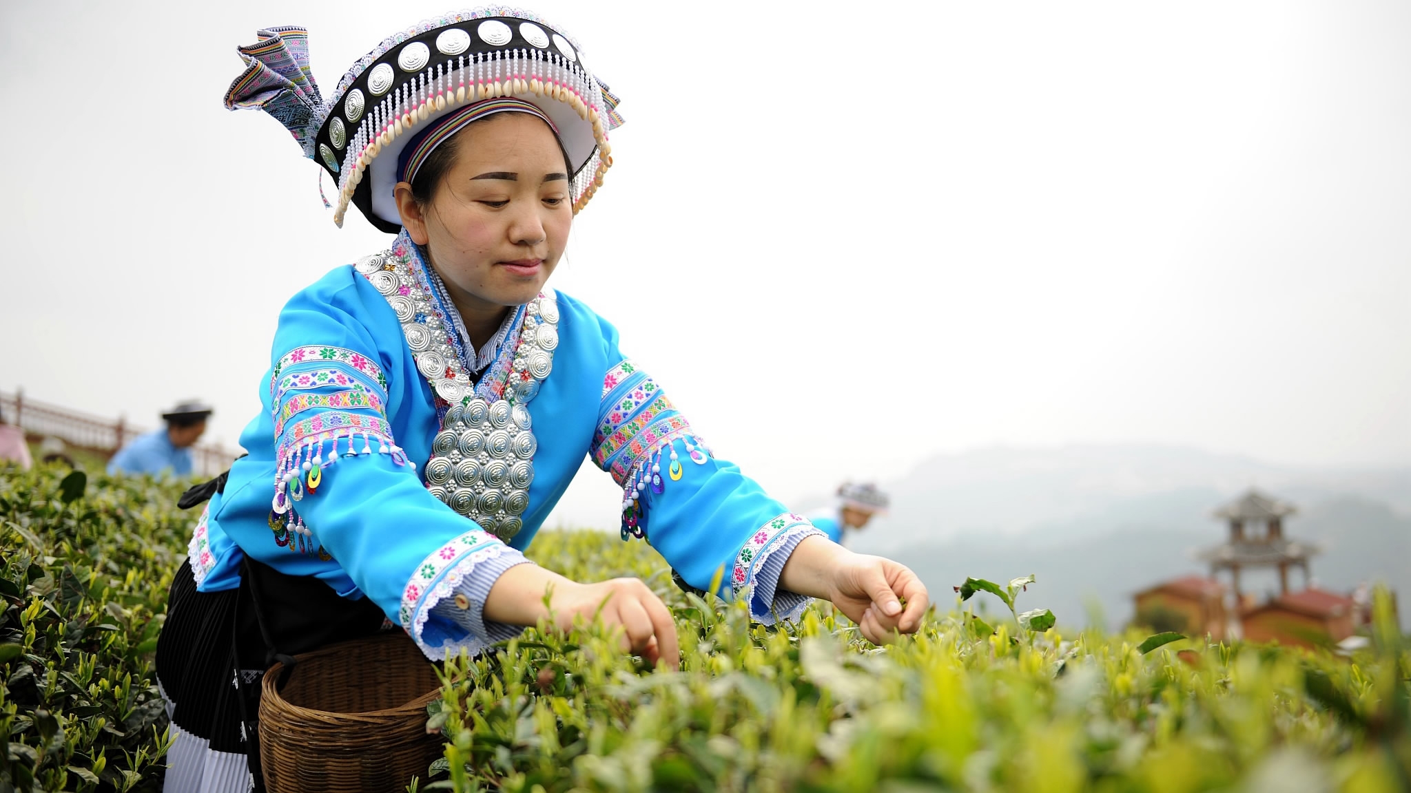 A woman wearing traditional costume picks tea leaves at the Laochapo tea plantation of Yunwu village. /VCG Photo