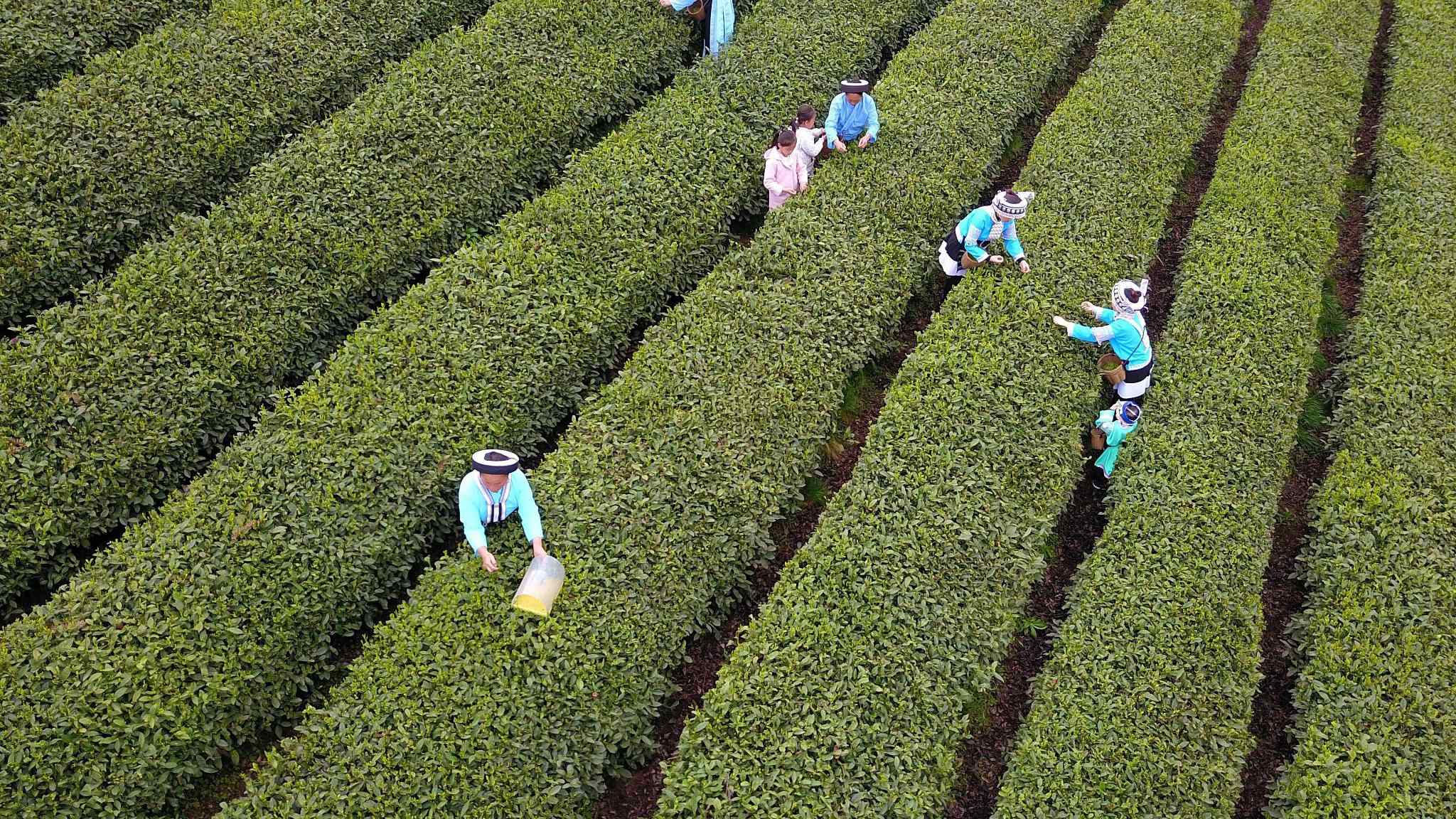 Farmers harvest the spring tea at a tea garden in Guiding County, southwest China's Guizhou Province on Saturday. /VCG Photo