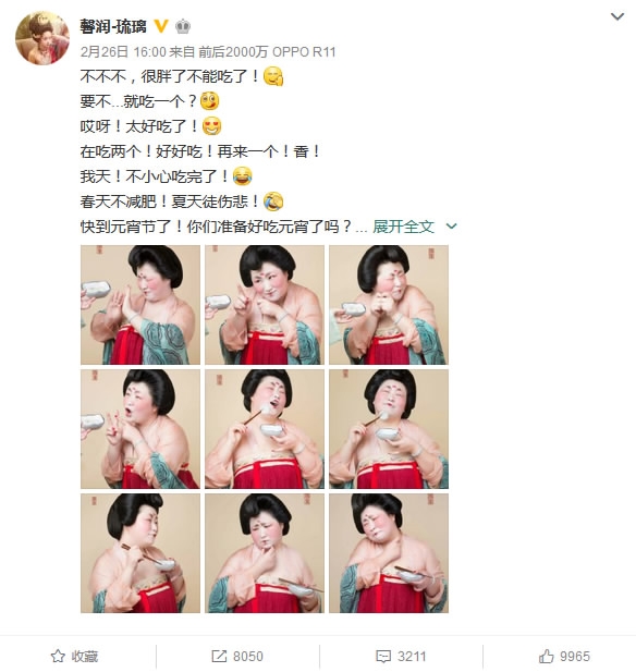 “I hope these pictures can make people laugh during the festival. The original idea of the woman dressed in Han-style clothes eating sweet dumplings was to combine traditional culture and popular internet jokes,” she told Beijing Youth Daily.