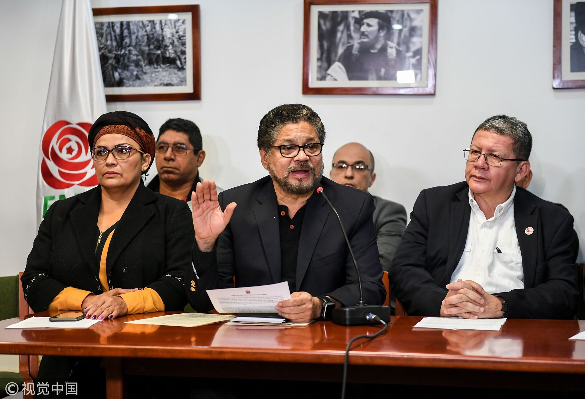 Ivan Marquez (C), Amparo Sandino (L) and Pablo Catatumbo members of the Common Alternative Revolutionary Force (FARC) political party, deliver a press message in Bogota, April 10, 2018. /VCG Photo