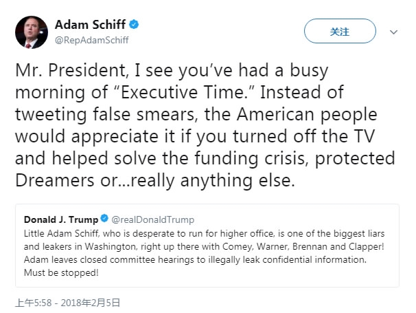 "Instead of tweeting false smears, the American people would appreciate it if you turned off the TV and helped solve the funding crisis, protected Dreamers or...really anything else," Schiff added.