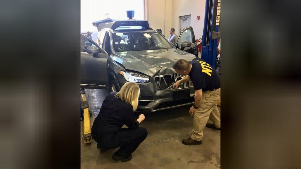 National Transportation Safty Board (NTSB) investigators examining a self-driving Uber vehicle involved in a fatal accident in Tempe, Arizona, US, March 20, 2018. /Reuters Photo
