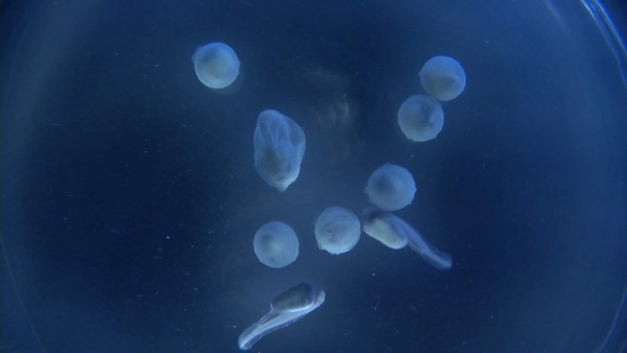 Eggs of Chinese sturgeons are seen becoming fish babies. /CGTN Photo