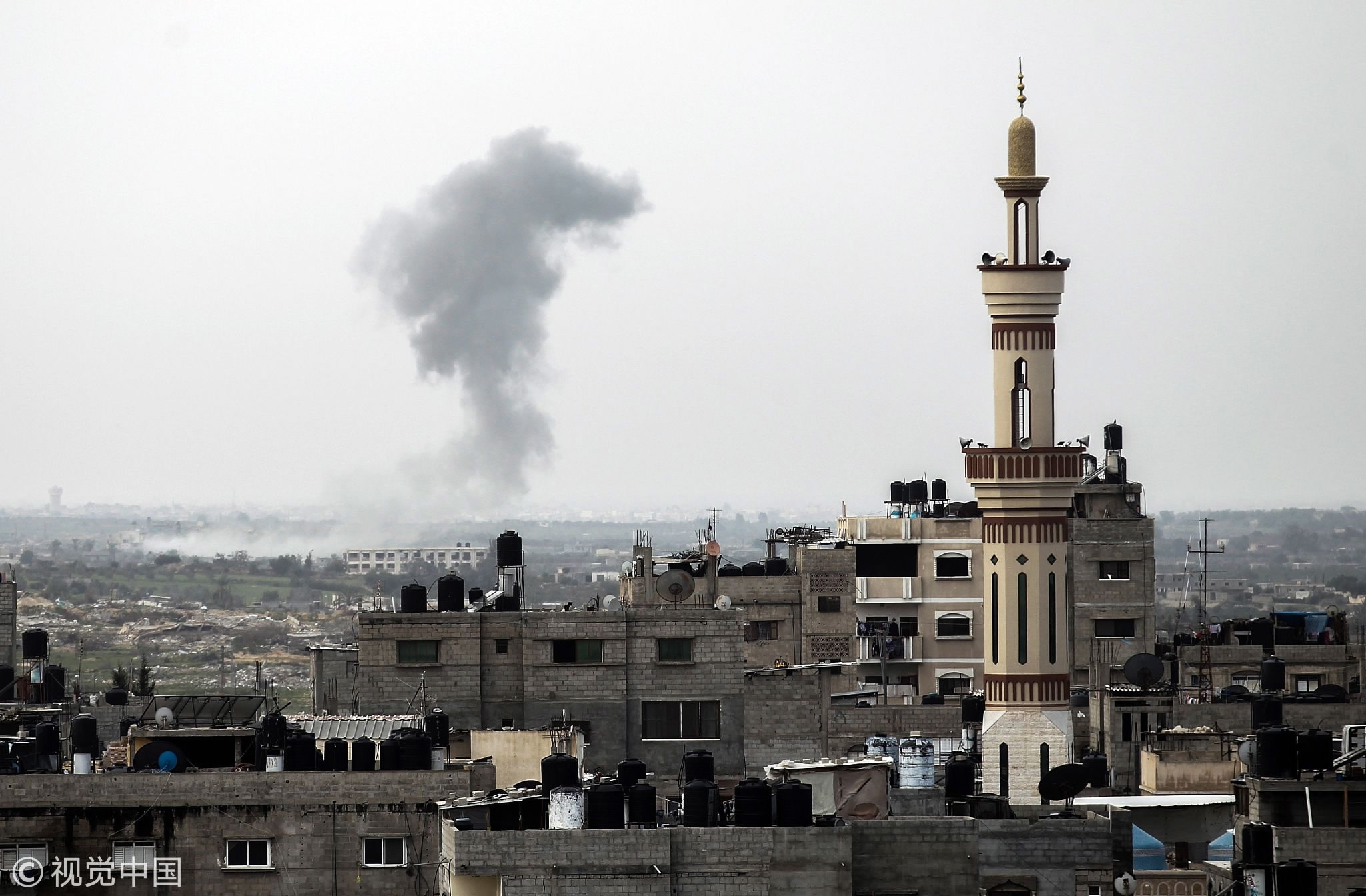 Smoke billows on the Egyptian side of the border following an explosion in Rafah in the southern Gaza Strip, February 10, 2018 . /VCG Photo