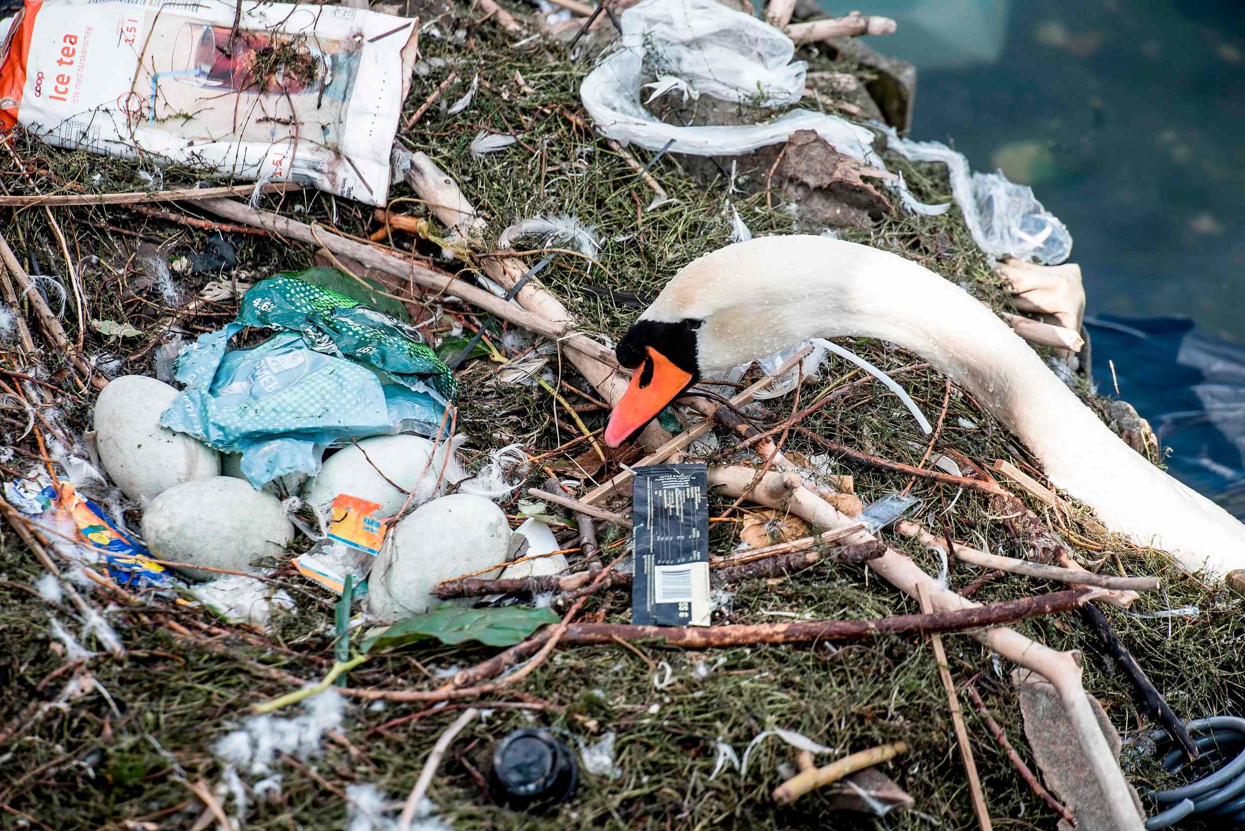 The swan's nest is partly made out of trash from the lake and contains several eggs. /VCG Photo
