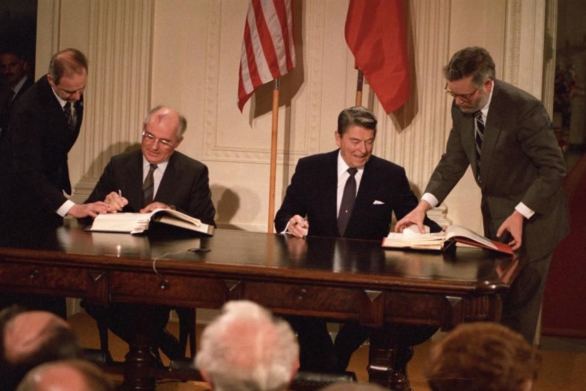 Former president Ronald Reagan (2nd R) and former Soviet president Mikhail Gorbachev (2nd L) sign the Intermediate-range Nuclear Forces treaty in the White House, December 8, 1987. /Reuters Photo