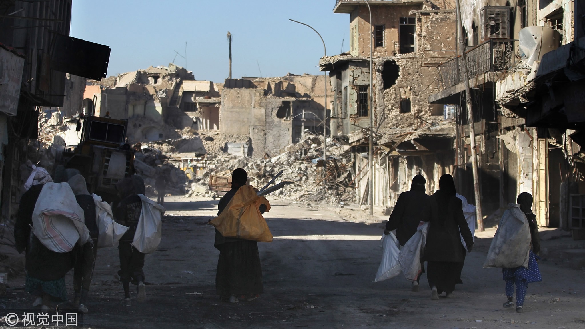 (Cover Photo: Iraqi women and children walk in the streets of Mosul's old city to collect copper from ruins to sell and make some money, on January 9, 2018. /VCG Photo)