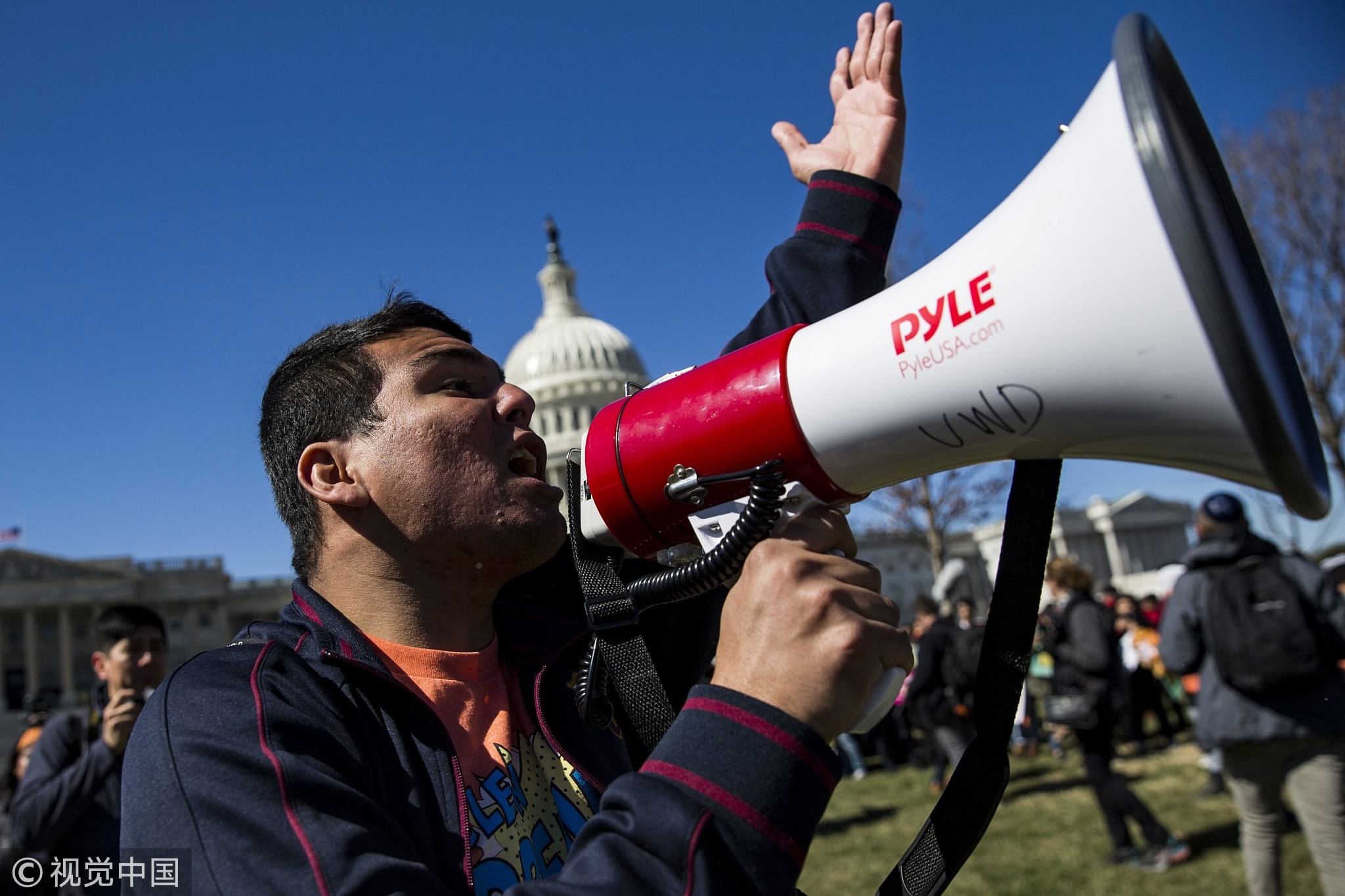 A man uses a megaphone to lead demonstrators in chants as they protest Trump's attempts to end the DACA, outside of the U.S. Capitol in Washington, USA on March 5, 2018. /VCG Photo