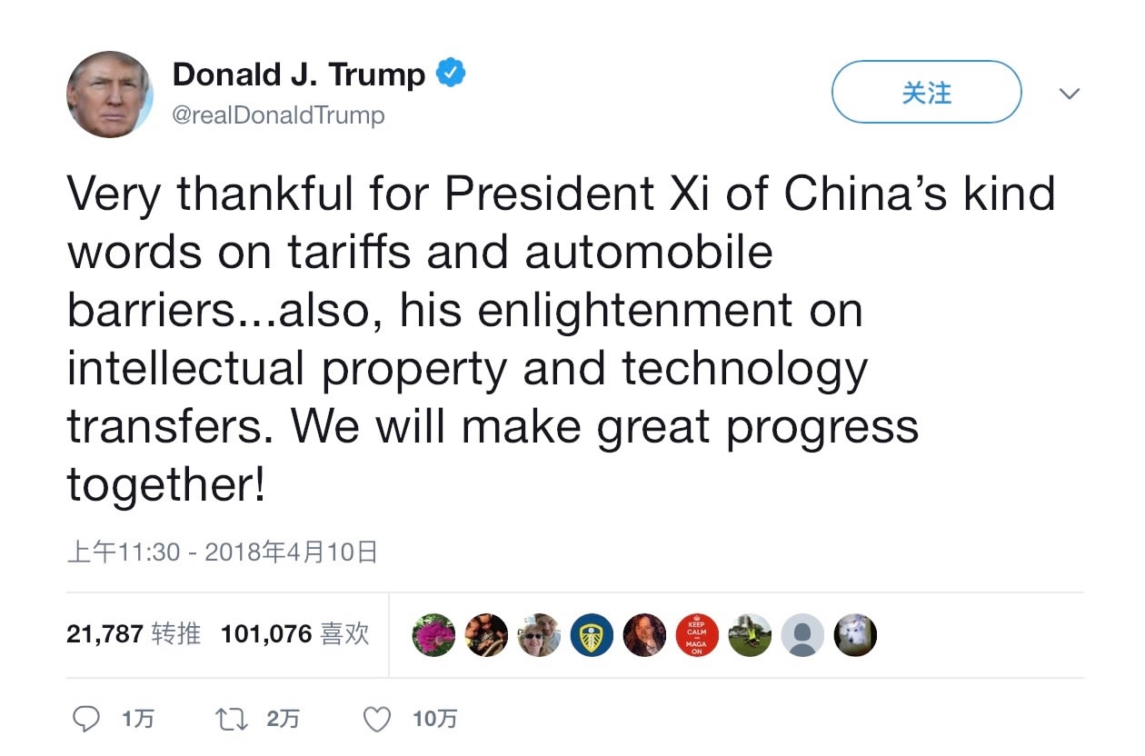 Trump made a swift response on Twitter, thanking Xi for his "kind words on tariffs and automobile barriers... also, his enlightenment on intellectual property and technology transfers." A host of established media have also started to associate these upbeat proclamations with attempts to avert the looming US-China trade war.